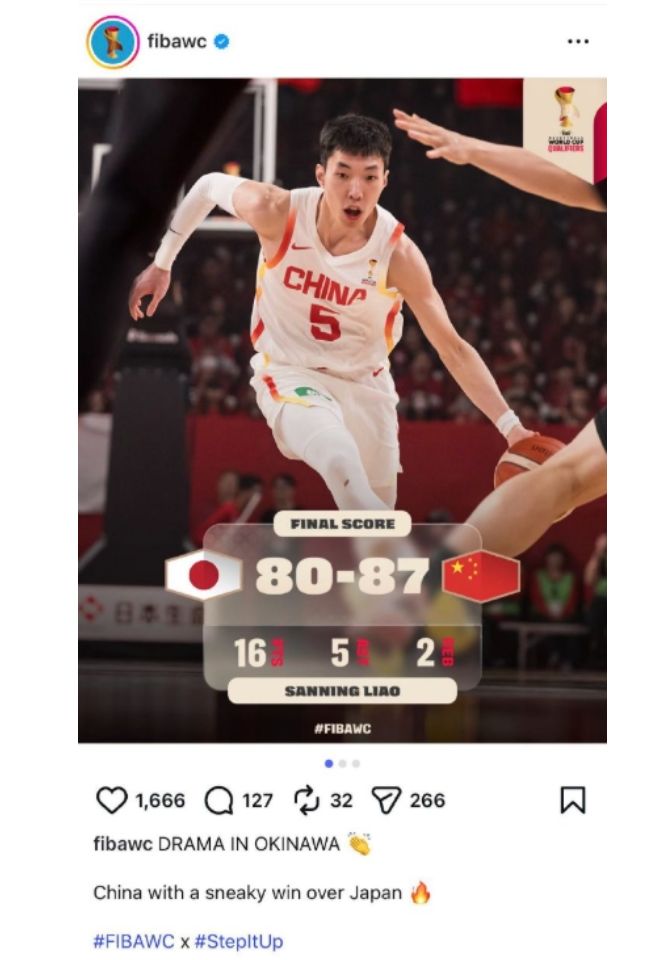 赛后,国际篮联(FIBA)官方更新社媒,发布了中国男篮在国际大赛上对阵日本男篮的数据,原文写道:中国队在对阵日本队的比赛中从落后15分的情况下逆转,这是他们在国际篮联重大比赛中与对手的22场比赛中取得的第20场胜利
